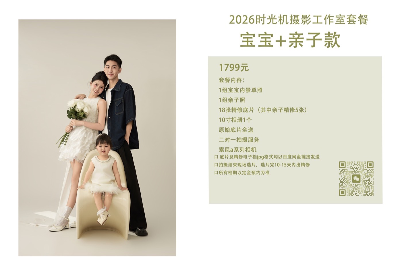 套餐内容: 1组宝宝内景单照 1组亲子照 18张精修底片(其中亲子精修5张) 10寸相册1本 原始底片全送 二对一拍摄服务 索尼a系列相机